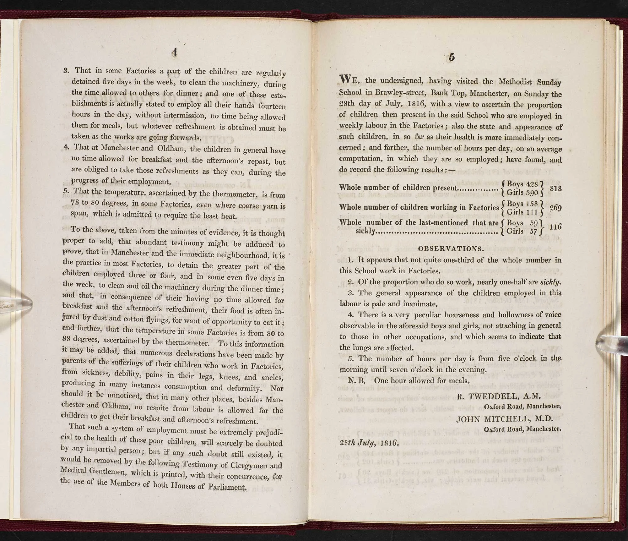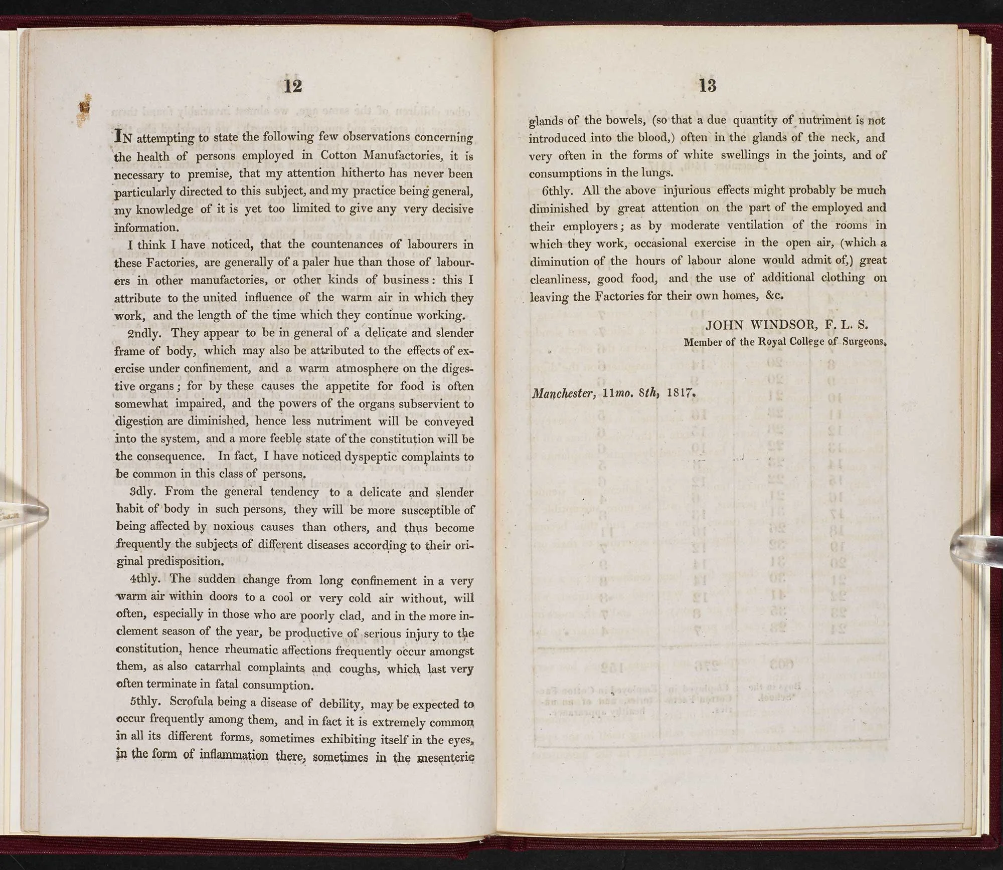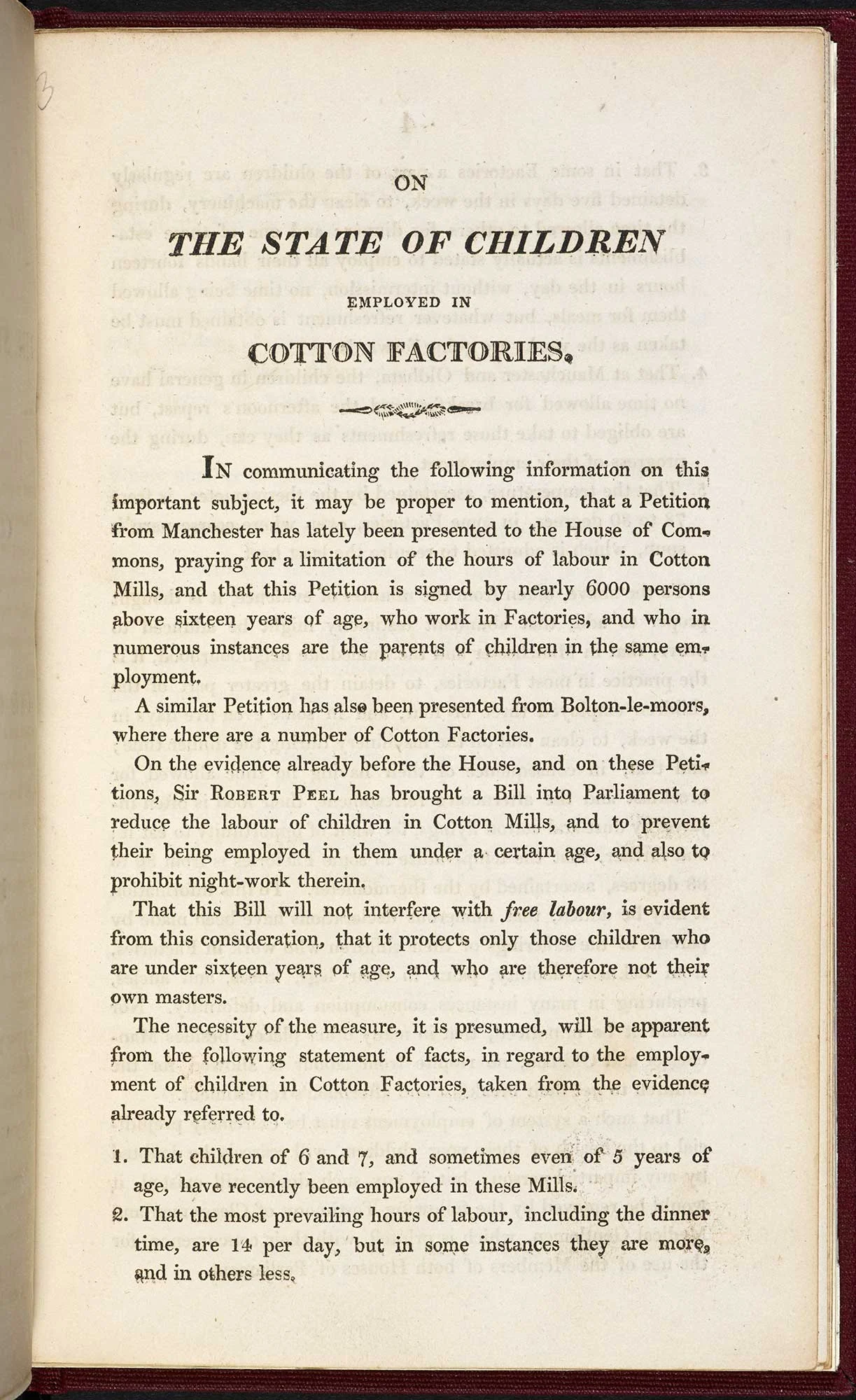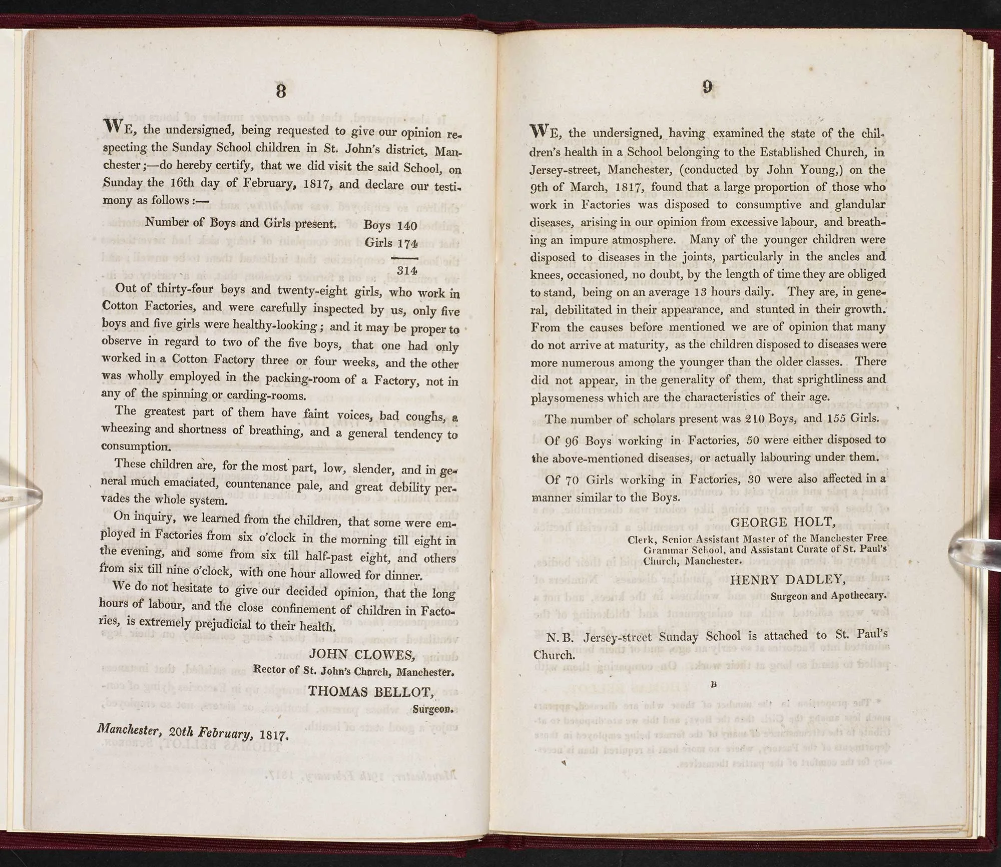 Published in 1818, this book contains statistical information on the health of the vast numbers of children working in cotton factories around Manchester. Doctors and surgeons, often working with ministers and curates, visited Sunday Schools between 1816 and 1818 to conduct research. While assessing the health of the children, examining everything from colds and coughs to muscle strength or evidence of deformity, information was also collected on the children’s working hours and the amount of time allowed for meals. This evidence fed in to the 1819 Cotton Mill Factory Act, which although never properly enforced, was designed to prevent children under nine years old from working in cotton factories and to restrict the working days of children in other factories to 12 hours. Medical inspections were seen to provide substantial evidence that factory conditions had a detrimental impact on children’s health, although little statistical evidence exists to compare the health of employed and non-employed children. [source: British Library].
